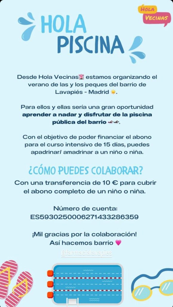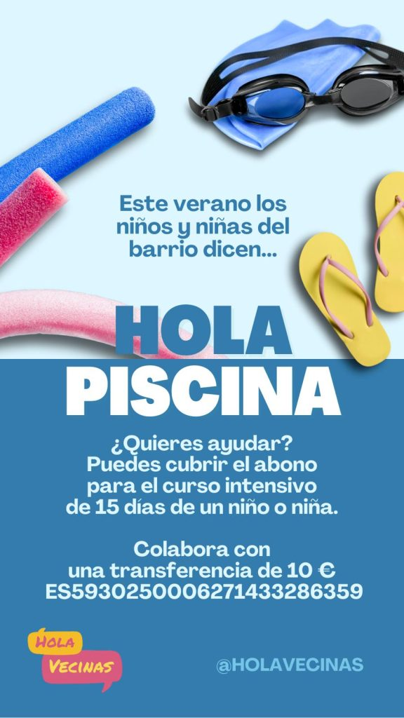 «Este año esta campaña busca no sólo que los niños aprendan a nadar, sino proporcionarles un pequeño parche que compense el cierre de Peñuelas y que les haga algo más llevadero el verano. En Lavapiés no hay refugios climáticos y nuestras familias son las más vulnerables a las altas temperaturas«, indican desde Hola Vecinas, soñando con conseguir suficiente dinero como para poder enviar a clases de natación una quincena en julio y otra en agosto a cada uno de sus niños.