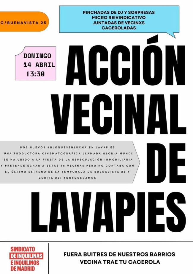 Con la ayuda del Sindicato de Inquilinas e Inquilinos de Madrid, son 10 las unidades familiares afectadas (16 vecinos) en los edificios de los números 22 de la calle Zurita y 25 de Buenavista, inmuebles comprados hace poco por la productora cinematográfica Gloriamundi, que se han declarado en lucha, mostrando su voluntad de no irse de las viviendas que habitan y pidiendo una negociación con la propiedad.