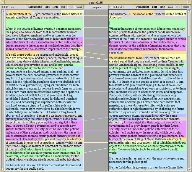 In fig. 5 we see early and final drafts of the Declaration of Independence (111), highlighting transclusions and differences with color.