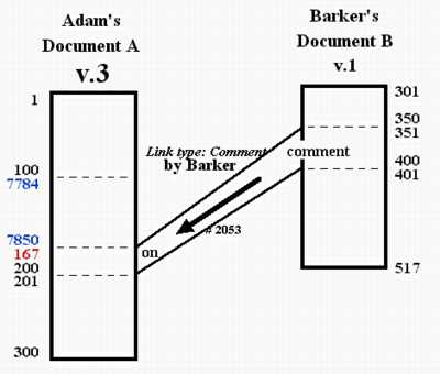 Suppose that in the text of Barker's document B, he has made a comment on Adam's document A. The text of the comment consists of characters 351 to 400; they comment on characters 101 to 200 in the middle part of A. While Barker's comment already resides in his text in written form, it gives no direct access to the material being commented on. So let us say that as the author, Barker chooses to make this textual relationship explicit, representing it as a comment link between those two spans (presumably using some comfortable visual editor to select the spans and specify the link type).