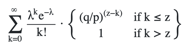 To get the probability the attacker could still catch up now, we multiply the Poisson density for each amount of progress he could have made by the probability he could catch up from that point: